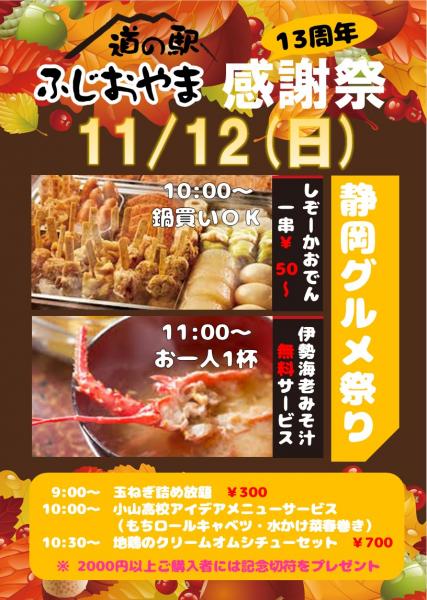 道の駅ふじおやまは、平成16年11月25日に開駅し、13周年を迎えます。 これも皆様の御愛顧の賜物と、心より御礼申し上げます。 というわけで!