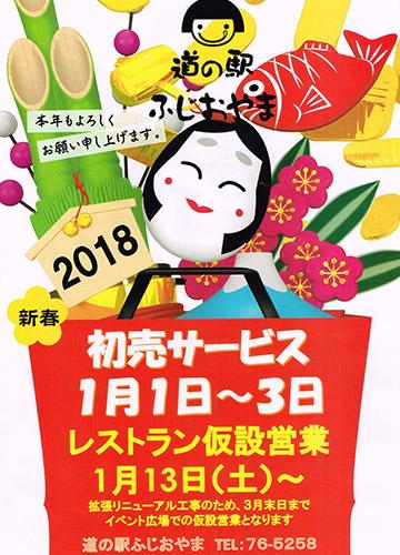 道の駅ふじおやまは 元旦から3日まで初売りサービスを実施。 (注:元旦は9:00~17:00までの営業となります) 甘酒の無料振る舞いやお年玉企画をご用意しております。 年末年始のドライブは道の駅ふじおやまへ是非お立ち寄りください。
