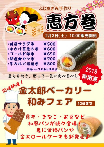 2月3日(土)は節分の日! 道の駅ふじおやまでは自家製恵方巻を販売いたします。 小山町特産の「水かけ菜」を使った恵方巻を始め、ふじあざみオリジナルの商品をご用意しております。 また、焼きたてパン「金太郎ベーカリー」では和みフェアを開催。 昆布・きなこ・お豆など和風パンが続々登場!鬼に金棒パンや金太ロールケーキも新発売いたします。 ご予約も承りますので店頭またはお電話にてお気軽にお申し付けください。