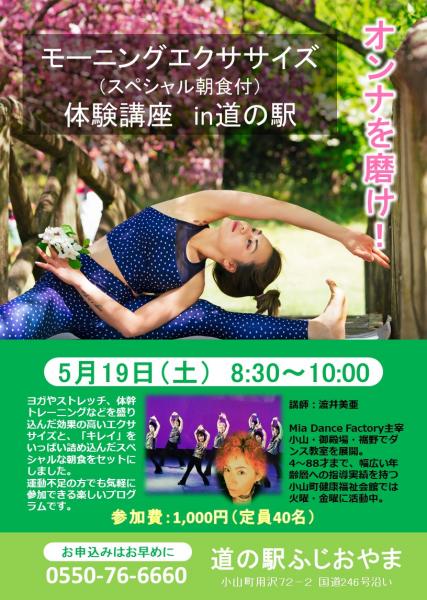 爽やかな新緑のもと、心地よく体を動かしてみませんか? 健康と美にこだわった、道の駅ふじおやまオリジナルのプログラムをぜひ体験してみてください! 2018年5月19日(土) 8:30~10:00 参加費:1,000円(体験料&朝食代) ご予約は0550-76-6660へお早めに♪