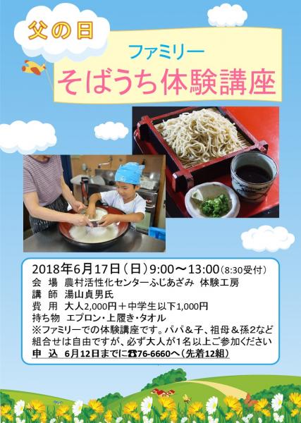 夏を先取りしたような日が続きますね。 暑くなると、さっぱりしたものが食べたくなります。 17日は父の日です! 御家族で「手打ちそば」にトライしてみませんか? 混ぜたり、こねたりしているうちに、家族の絆も深まりますよ♪ ご予約はお早めに・・・